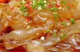 3.湯泡沙河粉,將沙河粉100克放在笊籬內,置沸水中燙熱,倒在碗內,加鮮湯、熟菜心、熟魚片或其他熟肉料,調味即成。